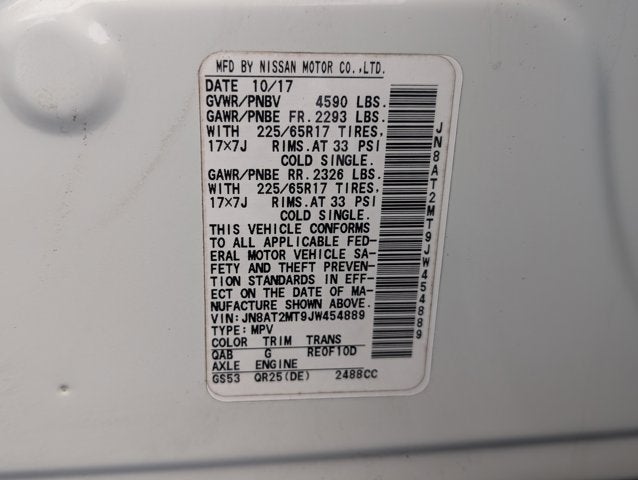 If you wish to have vehicle shipped to you, that is a separate charge determined by distance. Please use the listed price as the most up to date price. Racy yet refined, this 2018 Nissan Rogue represents a seamless convergence of unparalleled power and beauty. With a Regular Unleaded I-4 2.5 L/152 engine powering this Variable transmission, it is a vastly understated assertion of your dominion over the open highway. It is stocked with these options: PEARL WHITE, CHARCOAL, CLOTH SEAT TRIM, [Z66] ACTIVATION DISCLAIMER, [U35] NAVIGATION MANUAL, [L92] FLOOR MATS & 2-PC CARGO AREA PROTECTOR -inc: 2-pc front and 2-pc 2nd row floor mats, First Aid Kit, [K02] SUN & SOUND TOURING PACKAGE -inc: Bose Audio, 3 speakers (9 total), Tires: T155/90D17 Spare, Memory Driver Seat & Outside Mirrors, Power Panoramic Moonroof, Intelligent Aroundview Monitor (I-AVM), Intelligent Cruise Control (ICC), Heated Leather-Wrapped Steering Wheel, Radio: AM/FM/CD/AUX NissanConnect w/Navigation, Nissan door to door navigation w/3D building graphics and satellite imagery featuring POI search and online premium traffic information, HD radio, SiriusXM Traffic w/premium traffic information, SiriusXM travel link (weather, fuel prices, movie listings, stock info, sports and parking), NissanConnect services powered by SiriusXM, 7" color display w/multi-touch control, Apple CarPlay, Android Auto, SiriusXM Satellite Radio w/advanced audio features, USB connection port for iPod and other compatible devices, Bluetooth® hands-free phone system, streaming audio via Bluetooth®, hands-free text messaging assistant, over-the-air (OTA) updating for headunit firmware and naviga, [B93] CHROME REAR BUMPER PROTECTOR, [B92] BLACK SPLASH GUARDS (SET OF 4), Wireless Phone Connectivity, and Wheels: 17" Aluminum-Alloy . The Accessories include 2 Master Keys.