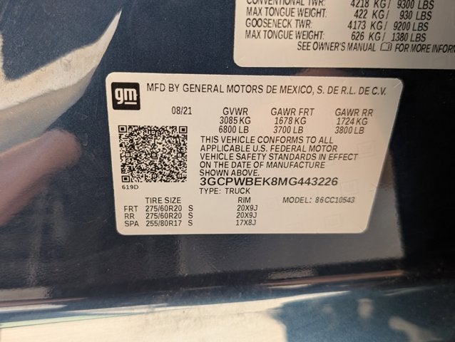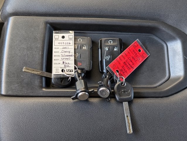 If you wish to have vehicle shipped to you, that is a separate charge determined by distance. Please use the listed price as the most up to date price. This vehicle has a notation on the Carfax that it was reacquired by the manufacturer. Simply put, the customer had a complaint about the vehicle and asked the manufacturer to take the car back. As a result, the trade value or selling price you will get for this vehicle is likely to be lower than for a similar vehicle that was not reacquired. This is reflected in the price you are paying for the vehicle now and why the vehicle is less expensive than a similar one that was not reacquired. In time, the difference in value between this vehicle and a normal vehicle will shrink. Therefore, if you plan to keep the vehicle for an extended period of time you will likely capture more of the savings of the lower price than if you sell or trade the vehicle within a short period after purchasing it. Elegantly expressive, this 2021 Chevrolet Silverado 1500 will envelope you in well- engineered charm and security. With a Turbocharged Gas I4 2.7L/166 engine powering this Automatic transmission, you will take joy in the thrilling ease with which you commandeer the road. It's outfitted with the following options: WHEELS, 20" X 9" (50.8 CM X 22.9 CM) BRIGHT SILVER PAINTED ALUMINUM (STD), TRANSMISSION, 8-SPEED AUTOMATIC, ELECTRONICALLY CONTROLLED with overdrive and tow/haul mode. Includes Cruise Grade Braking and Powertrain Grade Braking (STD), TIRES, 275/60R20 ALL-SEASON, BLACKWALL (STD), TAILGATE, MULTI-FLEX with six functional load/access features, SEATS, FRONT 40/20/40 SPLIT-BENCH with covered armrest storage (STD), REAR AXLE, 3.42 RATIO, POWER OUTLET, INSTRUMENT PANEL, 120-VOLT (400 watts shared with (KC9) bed mounted power outlet), POWER OUTLET, BED MOUNTED, 120-VOLT (400 watts shared with (KI4) instrument panel mounted power outlet), NORTHSKY BLUE METALLIC, and LICENSE PLATE KIT, FRONT . It was previously reacquired by the manufacturer for a non-conformity to the warranty (check engine light on). All necessary repairs were completed. The Accessories include 2 Master Keys.
